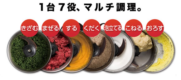 1台でなんと7役。きざむ/する/まぜる/くだく/あわだてる/こねる(ブレード)/おろす(グレーター)と